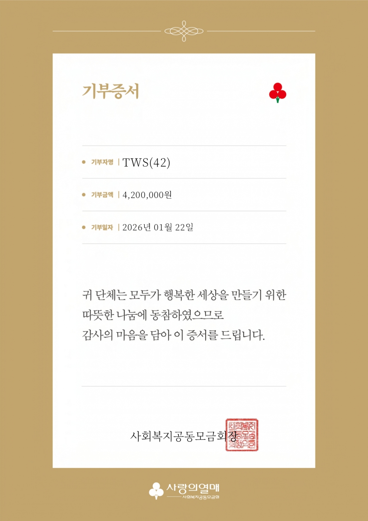 사랑의열매 관계자는 "아티스트와 팬이 서로의 이름을 빛내며 나눔을 주고받는 선순환의 가교가 되어 뜻깊다"며 "데뷔 2주년이라는 소중한 날을 기념하며 따뜻한 마음을 모아준 '42' 여러분께 감사드리며, 전달해주신 성금은 기부자의 뜻에 따라 도움이 필요한 청소년들을 지원하는 데 소중히 사용하겠다"고 밝혔다.