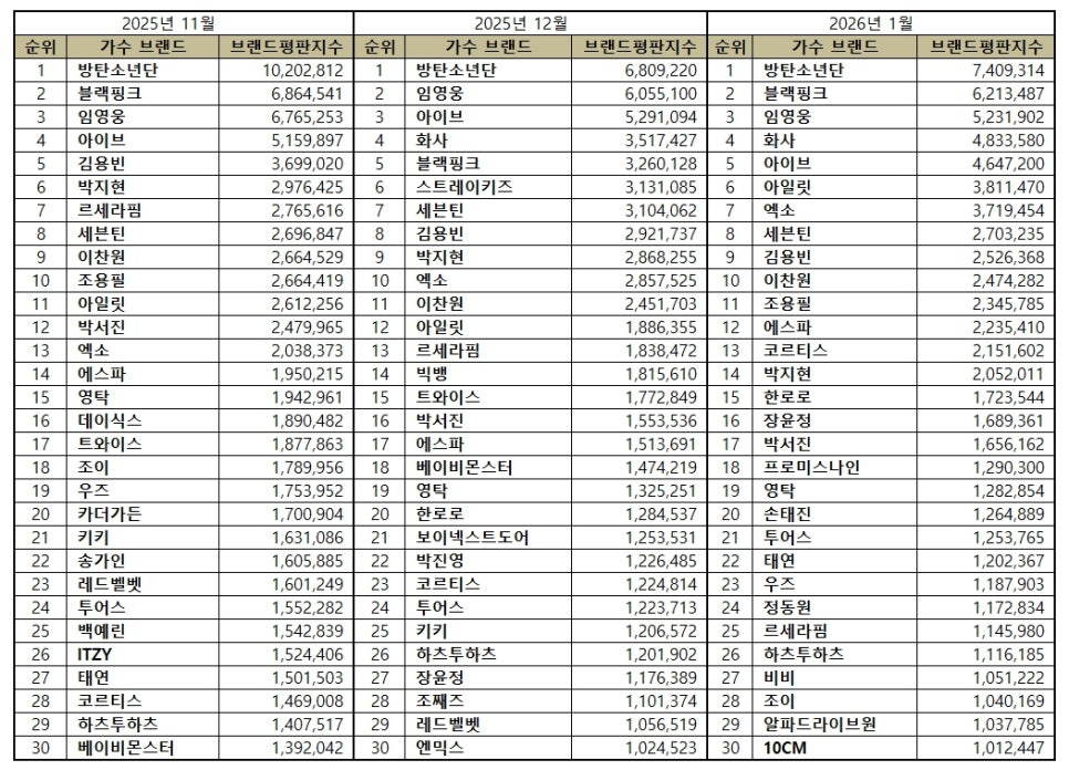 2026년 1월 가수 브랜드평판 30위 순위는 방탄소년단, 블랙핑크, 임영웅, 화사, 아이브, 아일릿, 엑소, 세븐틴, 김용빈, 이찬원, 조용필, 에스파, 코르티스, 박지현, 한로로, 장윤정, 박서진, 프로미스나인, 영탁, 손태진, 투어스, 태연, 우즈, 정동원, 르세라핌, 하츠투하츠, 비비, 조이, 알파드라이브원, 10CM 순으로 분석됐다.