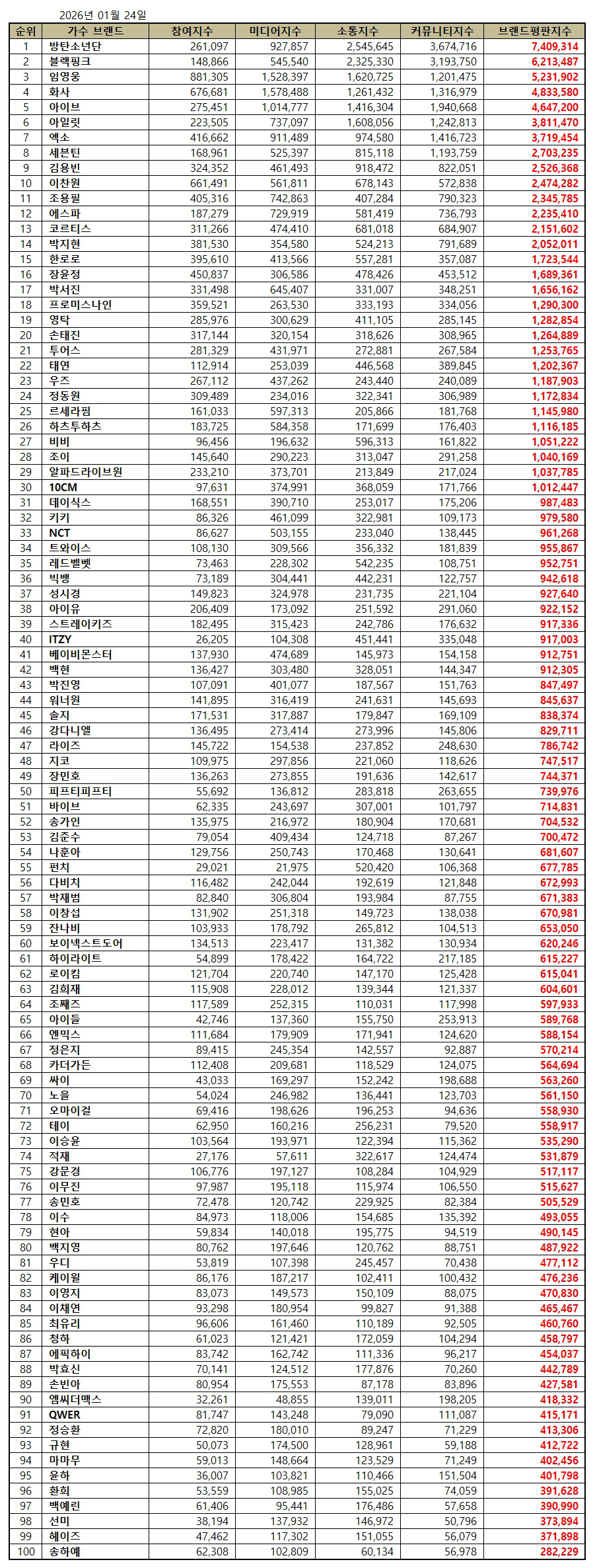 한국기업평판연구소는 2025년 12월 24일부터 2026년 1월 24일까지의 가수 브랜드 빅데이터 116,391,810개를 분석하여 소비자들의 브랜드 참여, 미디어, 소통, 커뮤니티 분석을 했다. 지난 12월 가수 브랜드 빅데이터 108,476,322개와 비교하면 7.30% 증가했다.