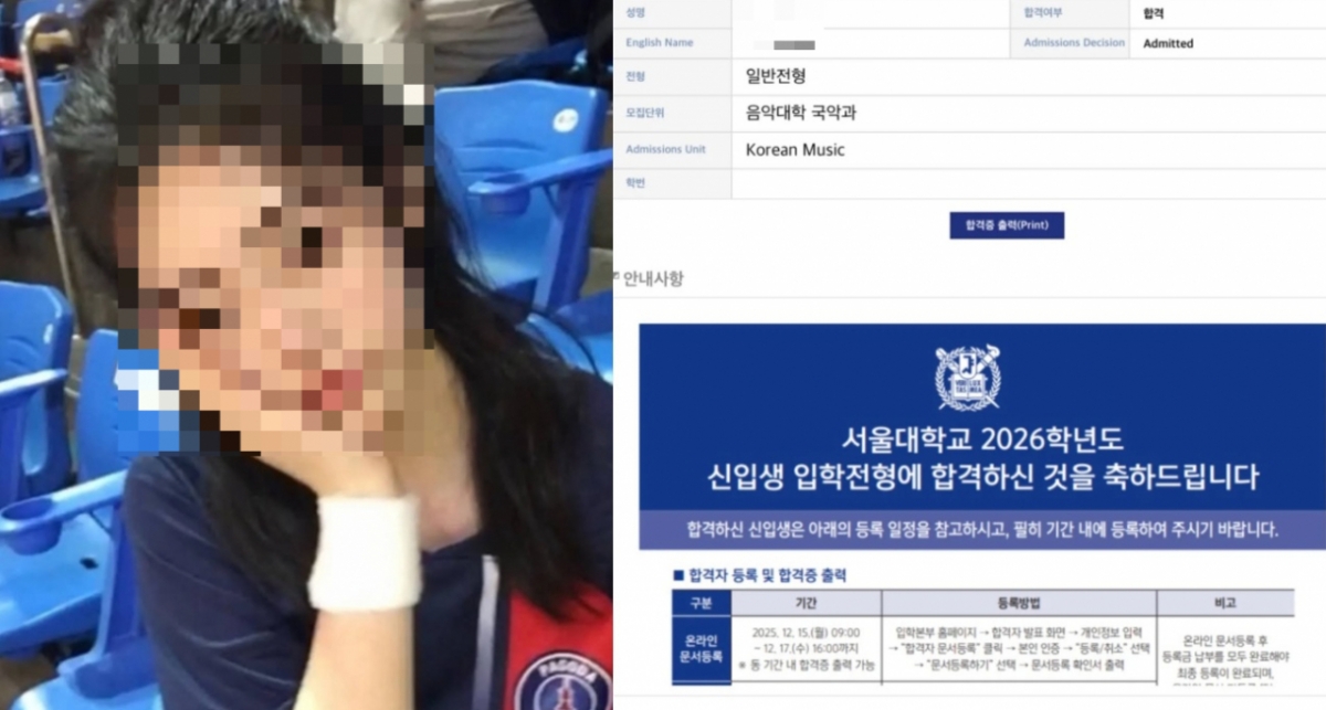 이에 따르면 A씨는 지난 2025년 10월 입시를 통해 한국예술종합학교 전통예술원과 서울대학교 국악과 수시모집 모두 합격했다.