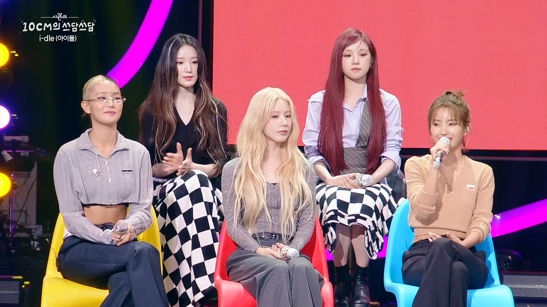 신곡 'Mono(모노)'와 함께 찾아온 아이들은 저마다 십센치와의 특별한 인연을 공개했다. 특히 민니는 데뷔 전 숙소 생활 당시, 소연의 모닝콜이 십센치의 '사랑은 은하수 다방에서'였음을 밝혀, 매일 아침 힘겨워했던 에피소드를 털어놨다. 이에 십센치가 즉석에서 라이브를 선보이자, 멤버들은 몸을 움츠리며 장난스러운 리액션을 선보여 웃음을 자아냈다. 소연은 "제일 좋아하는 노래라서 모닝콜로 정했다"며 곡에 대한 애정을 드러냈다.