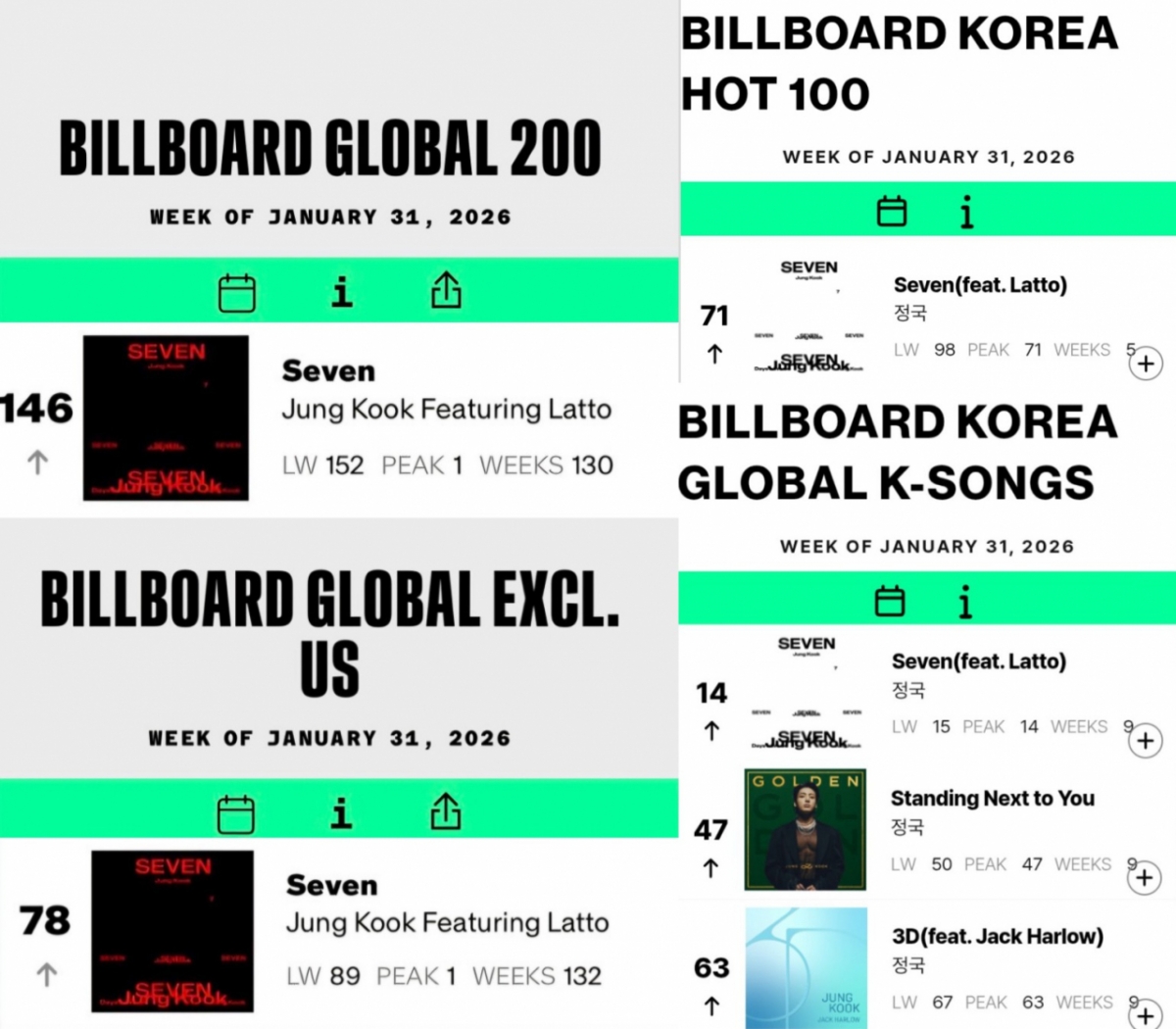 이와 함께 새롭게 신설된 빌보드 코리아 '핫 100' 차트에서도 'Seven'이 71위로 5주째 랭크됐다. 또한 빌보드 '글로벌 K-송즈' 차트에서 'Seven'은 14위, 'Standing Next To You'는 47위, '3D'는 63위에 올랐다. 세 곡 모두 9주째 진입에 성공했다.