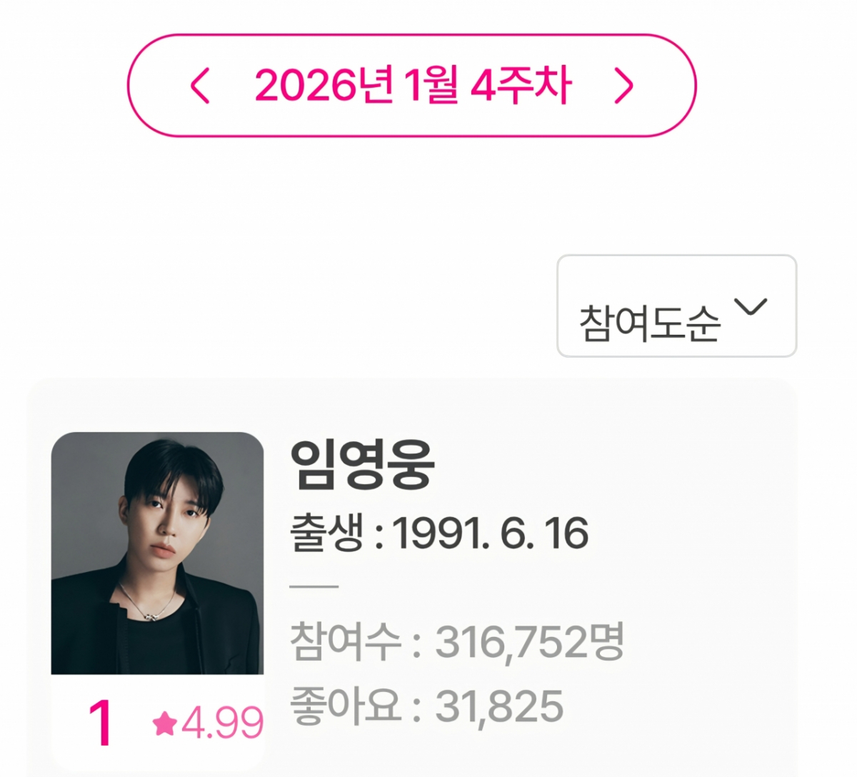 임영웅은 1월 26일부터 2월 1일까지 집계된 1월 4주차 아이돌차트 평점랭킹에서 31만 6752표를 얻어 최다득표를 기록했다.