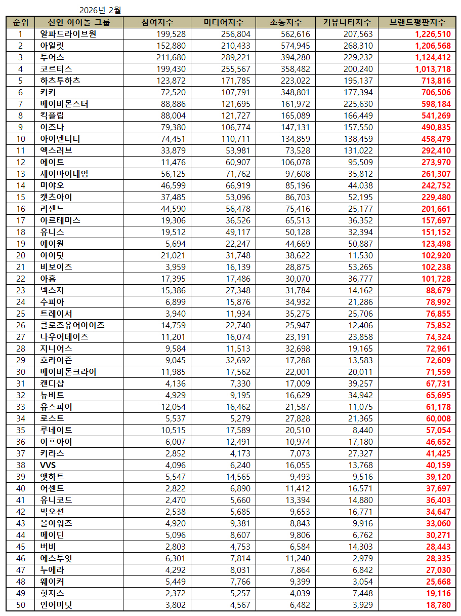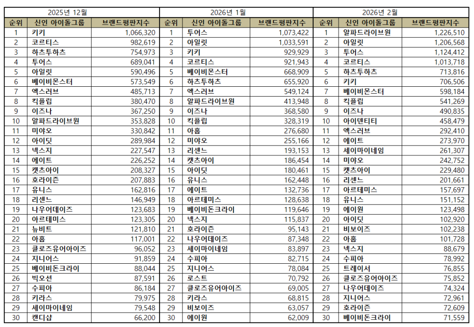 2026년 2월 신인 아이돌그룹 브랜드평판 30위 순위는 알파드라이브원, 아일릿 , 투어스, 코르티스, 하츠투하츠, 키키, 베이비몬스터, 킥플립, 이즈나, 아이덴티티, 엑스러브, 에이트, 세이마이네임, 미야오, 캣츠아이, 리센느, 아르테미스, 유니스, 에이원, 아이딧, 비보이즈, 아홉, 넥스지, 수피아, 트레이서, 클로즈유어아이즈, 나우어데이즈, 지니어스, 호라이즌, 베이비돈크라이 순으로 분석됐다.