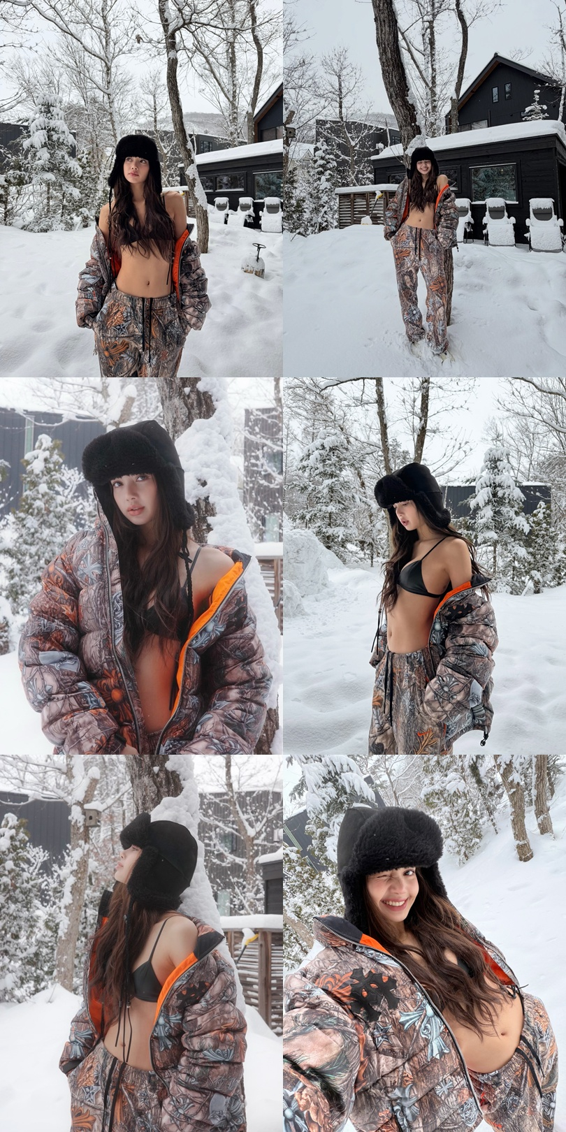 사진에는 리사가 눈이 잔뜩 쌓인 숙소에 머물며 여가시간을 즐기는 모습이 있었다. 그는 숙소 앞 눈 위에 서서 패딩 재킷을 반만 걸치고 속옷을 노출하는 이색적인 모습도 선보였다.