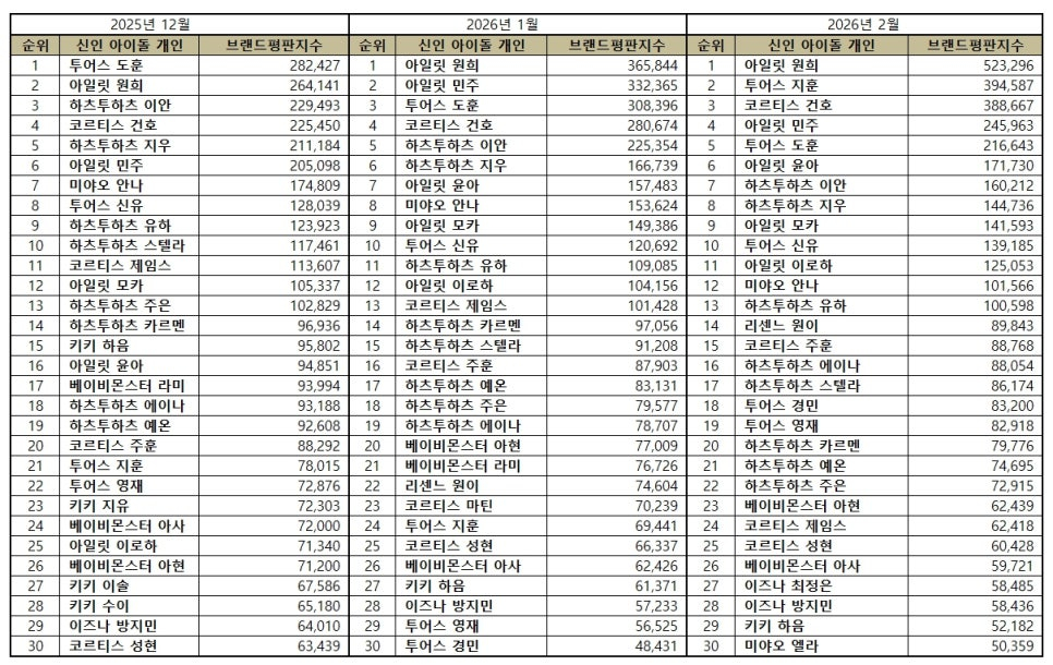 2026년 2월 신인 아이돌 개인 브랜드평판 30위 순위는 아일릿 원희, 투어스 지훈, 코르티스 건호, 아일릿 민주, 투어스 도훈, 아일릿 윤아, 하츠투하츠 이안, 하츠투하츠 지우, 아일릿 모카, 투어스 신유, 아일릿 이로하, 미야오 안나, 하츠투하츠 유하, 리센느 원이, 코르티스 주훈, 하츠투하츠 에이나, 하츠투하츠 스텔라, 투어스 경민, 투어스 영재, 하츠투하츠 카르멘, 하츠투하츠 예온, 하츠투하츠 주은, 베이비몬스터 아현, 코르티스 제임스, 코르티스 성현, 베이비몬스터 아사, 이즈나 최정은, 이즈나 방지민, 키키 하음, 미야오 엘라 순으로 분석됐다.