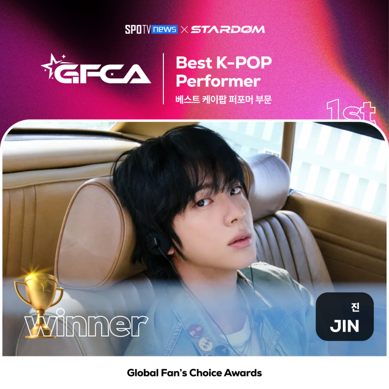 진은 스포티비뉴스와 팬 투표 플래폼 스타덤(STARDOM)이 공동으로 진행한 '2025년 글로벌 팬스 초이스 어워즈(Global Fan's Choice Awards)에서 '베스트 K-POP 퍼포머' 부문 1위를 차지하며 압도적인 존재감을 입증했다. 해당 부문에서 진은 무려 집계의 82%, 총 5847표를 획득해 다른 후보들과 현격한 격차를 보였다.