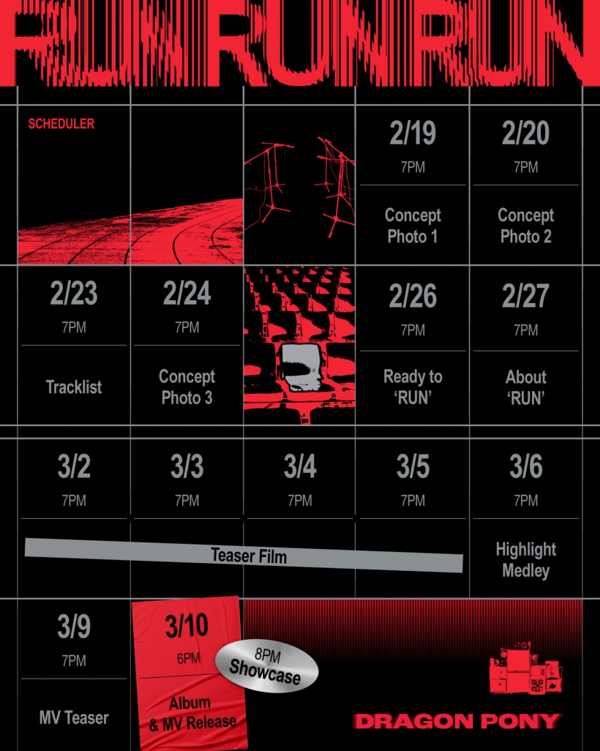 공개된 스케줄러 이미지에는 강렬한 블랙 앤 레드 톤의 조화 속에 앨범 타이틀 로고인 'RUN RUN RUN'이 등장, 타이포그래피로 강조된 파열감에서 드래곤포니가 이번 EP로 보여줄 음악적 에너지를 기대케 했다.