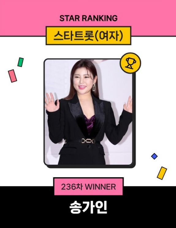 송가인은 지난 2월 12일 오후 3시 1분부터 19일 오후 3시까지 진행된 236차 스타랭킹 스타트롯 여자 랭킹 투표에서 10만 4059표를 얻으며 1위에 올랐다. 그는 236주 연속 1위 자리를 유지하며 대기록을 썼다.
