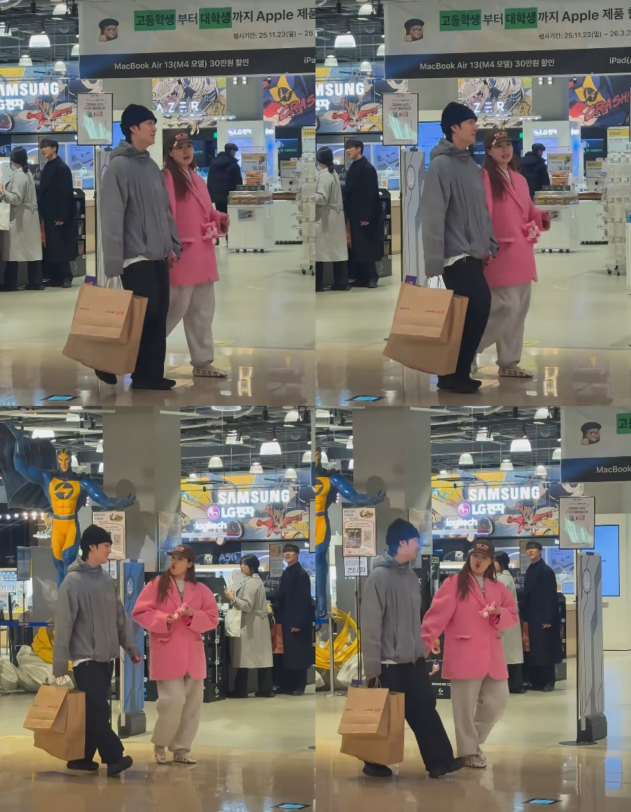 현아는 용준형에게 개구진 표정을 지으며 말을 걸고 있었고, 쇼핑백 짐을 든 용준형은 현아를 바라보며 웃고 있었다. 현아가 용준형의 손을 잡고 리드하며 걷는 듯한 모습이었다.