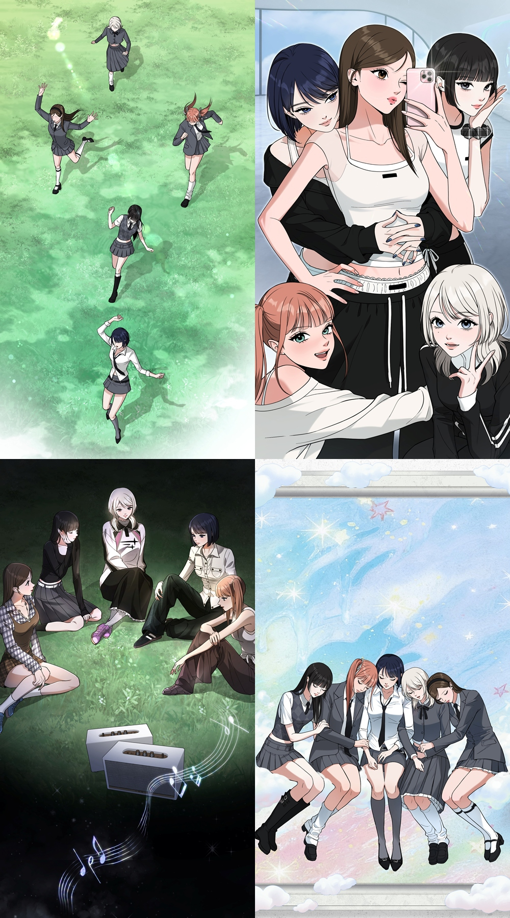 함께 공개된 웹툰에는 멤버들의 비주얼과 일상이 담겼다. 푸른 초원을 달리는 장면부터 교복 차림으로 연습실 거울 앞에 모여 셀카를 찍는 친근한 모습까지 다양한 순간들이 펼쳐졌다.