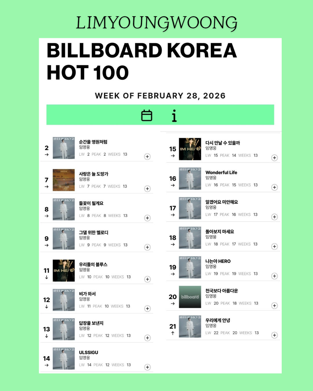 Billboard Korea Hot 100 집계에서 임영웅은 13주 연속 15곡을 진입시키며 음원 강자임을 다시 한번 입증했다. HOT 100에 진입한 곡은 '순간을 영원처럼'이 2위, '사랑은 늘 도망가'가 7위, '들꽃이 될게요'가 8위, '그댈 위한 멜로디'가 9위, '우리들의 블루스'가 11위, '비가 와서'가 12위, '답장을 보낸지'가 13위, 'ULSSIGU'가 14위, '다시 만날 수 있을까'가 15위, 'Wonderful Life'가 16위, '알겠어요 미안해요'가 17위, '돌아보지 마세요'가 18위, '나는 HERO'가 19위, '천국보다 아름다운'이 20위, '우리에게 안녕'이 21위를 기록했다.