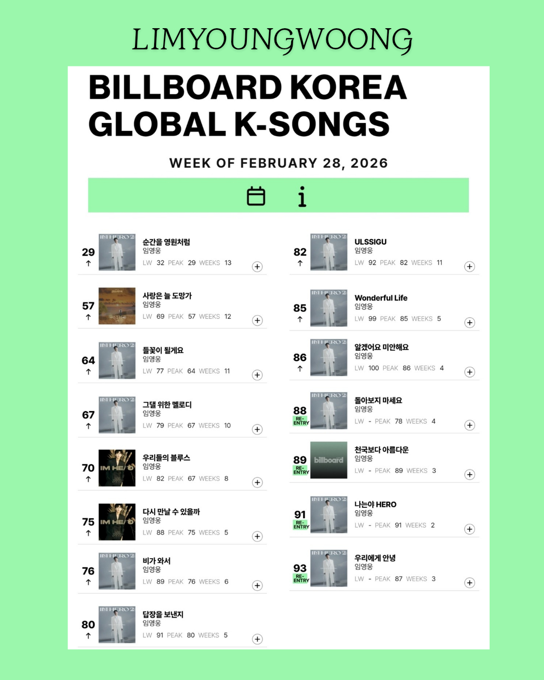 Billboard Korea Global K-Songs 집계에서도 임영웅은 톱100에 15곡을 진입시켰다. '순간을 영원처럼'이 29위, '사랑은 늘 도망가'가 57위, '들꽃이 될게요'가 64위, '그댈 위한 멜로디'가 67위, '우리들의 블루스'가 70위, '다시 만날 수 있을까'가 75위, '비가 와서'가 76위, '답장을 보낸지'가 80위, 'ULSSIGU'가 82위, 'Wonderful Life'가 85위, '알겠어요 미안해요'가 86위, '돌아보지 마세요'가 88위, '천국보다 아름다운'이 89위, '나는야 HERO'가 91위, '우리에게 안녕'이 93위를 차지했다.