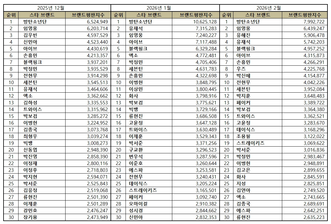 스타 브랜드평판 2026년 2월 빅데이터 분석 100위는 방탄소년단, 임영웅, 유해진, 유재석, 블랙핑크, 아이브, 손흥민, 우즈, 박신혜, 전현무, 세븐틴, 박지훈, 페이커, 박보검, 트와이스, 고윤정, 데이식스, 조용필, 스트레이키즈, 박서준, 박정민, 이병헌, 김고은, 화사, 지성, 김연아, 엑소, 김종국, 에스파, 류현진, 김동현, 박지현, 이찬원, 박진영, 손석구, 김혜수, 강호동, 신동엽, 에이핑크, 키키, 강다니엘, 현빈, 장윤정, 추성훈, 이정후, 김용빈, 라이즈, 서장훈, 성시경, 아이유, 조인성, 태연, 이제훈, 김준호, 손예진, 이성민, 황정민, 르세라핌, 하정우, 신민아, 구교환, 김우빈, 송가인, 공유, 이준혁, 기안84, 정해인, 엔하이픈, 유지태, 김혜윤, 문가영, 김연경, 다비치, 안정환, 한지민, 지석진, 워너원, 정동원, 황희찬, 진세연, 변우석, 박재범, 장민호, 이서진, 영탁, 이주빈, 비비, 문상민, 권상우, 안보현, 김준수, 프로미스나인, 탁재훈, 이지혜, 박서진, 최우식, 남지현, 이상민, 노시환, 주우재 순으로 분석됐다.