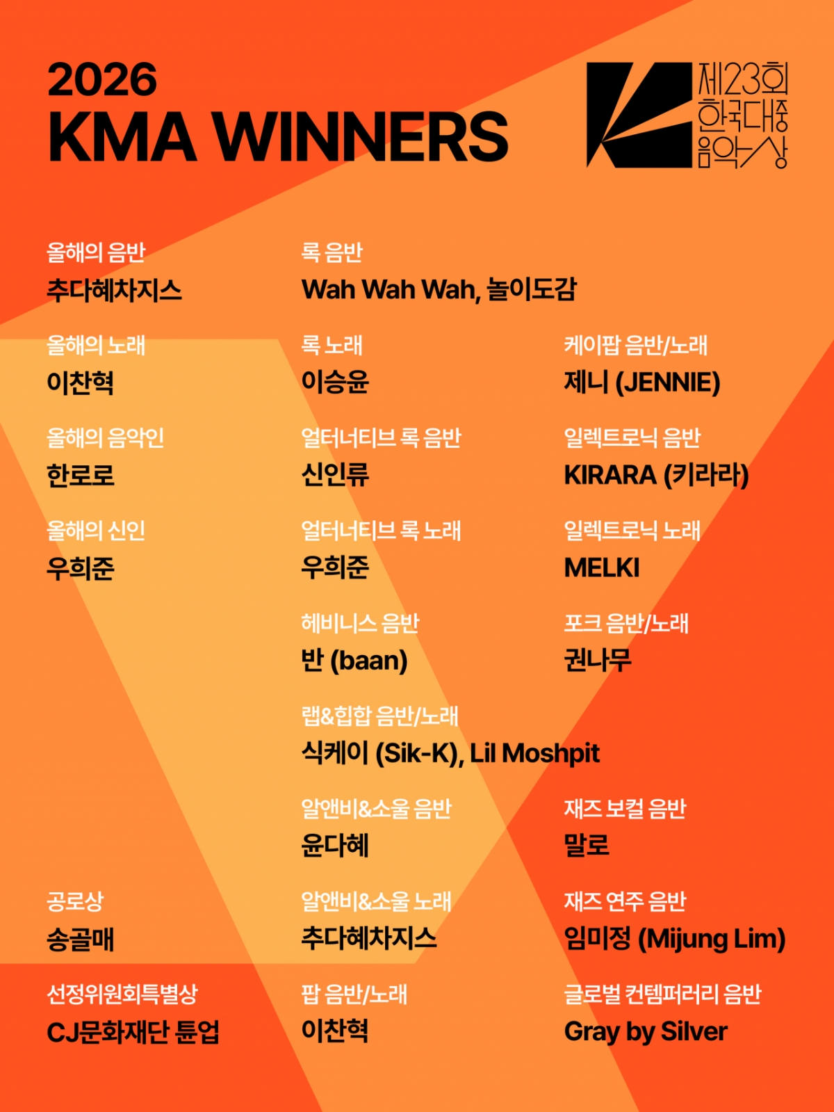 올해의 음악인은 한로로가 차지했으며 추다혜차지스는 '올해의 음반'과 함께 '최우수 알앤비&소울-노래' 부문에 선정되며 2관왕에 올랐다.