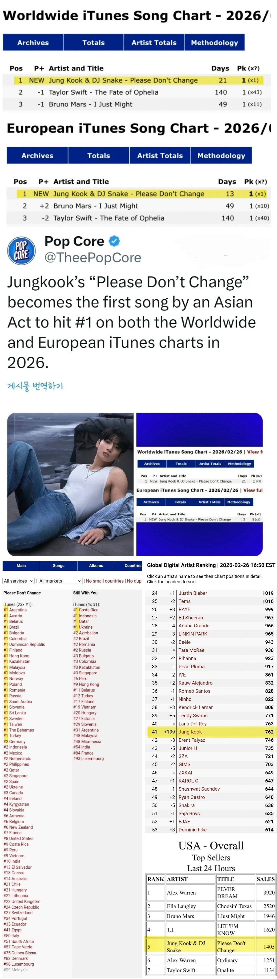 정국이 2023년 11월 발매한 첫 솔로 앨범 'GOLDEN'의 수록곡 'Please Don't Change'은 2월 26일 자 아이튠즈 월드와이드와 유러피안 송 차트 모두에서 1위로 재진입했다.