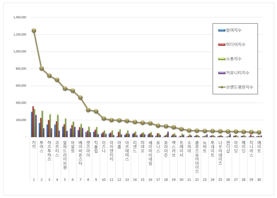 2026년 3월 신인 아이돌그룹 브랜드평판 30위 순위는 키키, 투어스, 하츠투하츠, 코르티스, 알파드라이브원, 아일릿, 베이비몬스터, 캣츠아이, 킥플립, 이즈나, 아이덴티티, 아홉, 아르테미스, 리센느, 미야오, 세이마이네임, 유니스, 호라이즌, 엑스러브, 트레이서, 수피아, 클로즈유어아이즈, 뉴비트, 루네이트, 나우어데이즈, 캔디샵, 아이딧, 메이딘, 지니어스, 에이트 순으로 분석됐다.