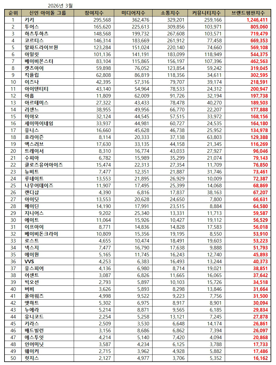 신인 아이돌그룹 브랜드평판 2026년 3월 빅데이터 분석결과, 1위 키키 2위 투어스 3위 하츠투하츠 순으로 분석됐다.