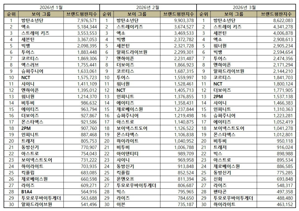 2026년 3월 보이그룹 브랜드평판 30위 순위는 방탄소년단, 스트레이 키즈, 세븐틴, 엑소, 워너원, 빅뱅, 투어스, 엔하이픈, 알파드라이브원, 코르티스, NCT, 더보이즈, 2PM, 샤이니, 인피니트, 슈퍼주니어, 에이티즈, 보이넥스트도어, 몬스타엑스, 비투비, 트레저, 빅스, 아스트로, 제로베이스원, 동방신기, 신화, 라이즈 보이그룹, 펜타곤, 투모로우바이투게더, 하이라이트 순으로 분석됐다.