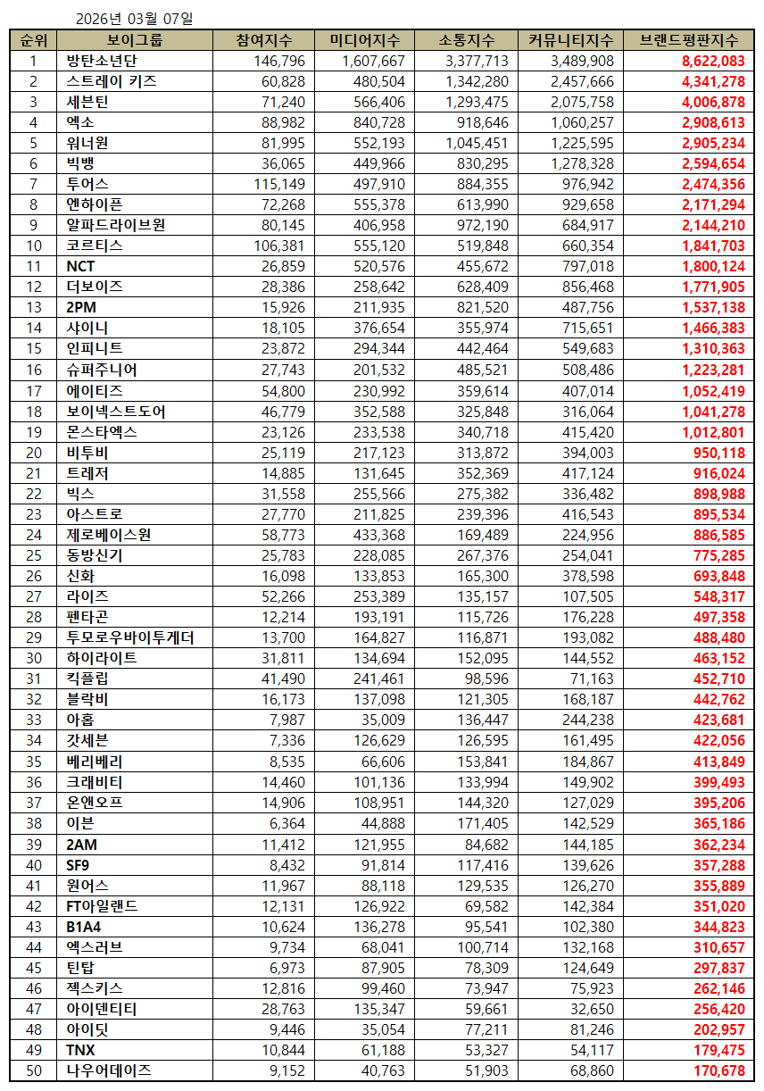 한국기업평판연구소는 2026년 2월 7일부터 2026년 3월 7일까지 측정한 보이그룹 브랜드 빅데이터 61,006,053개를 소비자 행동분석을 통해 보이그룹 브랜드에 대한 참여지수, 미디어지수, 소통지수, 커뮤니티지수를 측정했다. 지난 2월 보이그룹 브랜드 빅데이터 60,890,349개와 비교해보면 0.19% 증가했다.