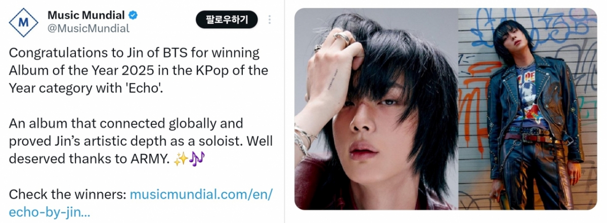 진의 솔로 앨범 'Echo'(에코)는 뮤직 문디알(Music Mundial)이 공식 홈페이지를 통해 발표한 '2025년 올해의 K팝 앨범' 1위를 차지했다. 뮤직 문디알은 진의 'Echo'가 2025년 최고의 앨범으로 선정되었다며 전 세계 투표자들의 선택을 받은 진이 올해 가장 영향력 있는 솔로 아티스트라고 밝혔다.