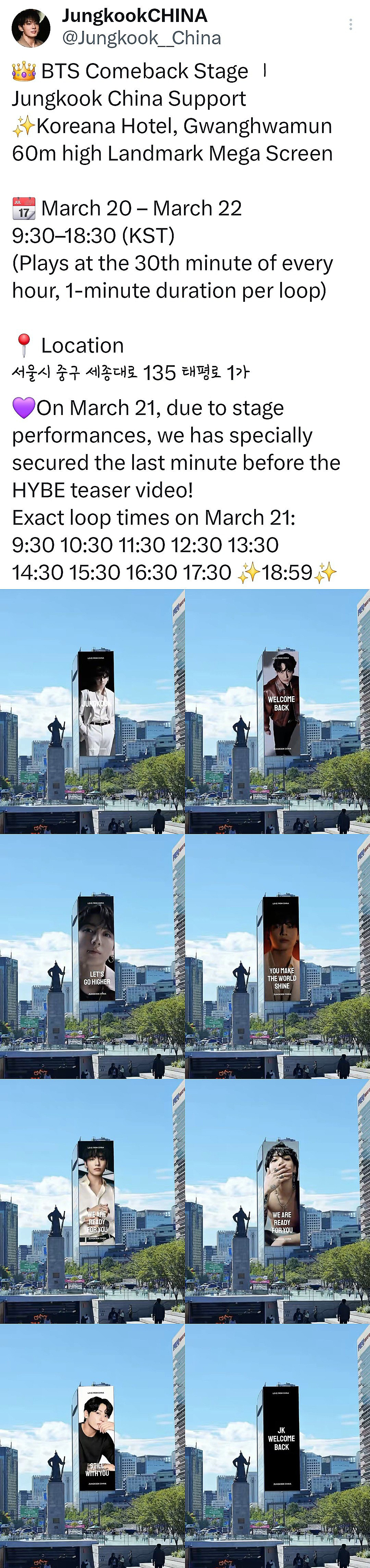 '정국 차이나'는 3월 20일부터 22일까지 3일간 광화문 사거리 세종대로와 청계천이 만나는 지점에 있는 코리아나호텔 전광판에서 광고를 송출한다. 이 전광판은 농구장 3개 크기인 약 363평(1200㎡) 규모로, 팬클럽은 하루 9시간 반 동안 매시 30분마다 1분씩 영상을 재생하며 응원했다.