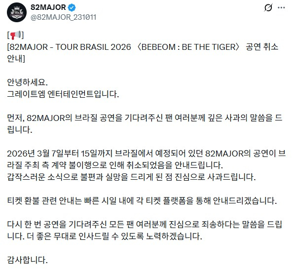 [82MAJOR - TOUR BRASIL 2026 〈BEBEOM : BE THE TIGER〉 공연 취소 안내]