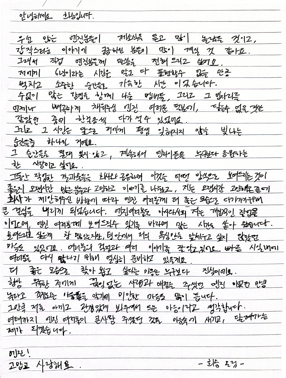희승 역시 이날 손편지를 통해 "저는 오랜 시간 고민해 온 끝에 회사가 제안해 주신 방향에 따라 엔진 여러분게 더 좋은 모습으로 다가가기 위해 큰 결심을 내리게 됐다"라며 "계속해서 엔하이픈을 누구보다 응원하는 한 사람이고 싶다"라면서 탈퇴 사실을 밝혔다.