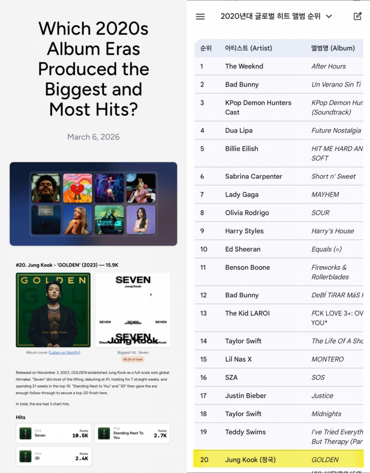 정국의 첫 솔로 앨범 'GOLDEN'은 최근 '토크 오브 더 차트'(Talk of the Charts)가 발표한 '2020년대 강력한 히트곡을 가장 많이 배출한 앨범 톱20' 20위에 이름을 올렸다.