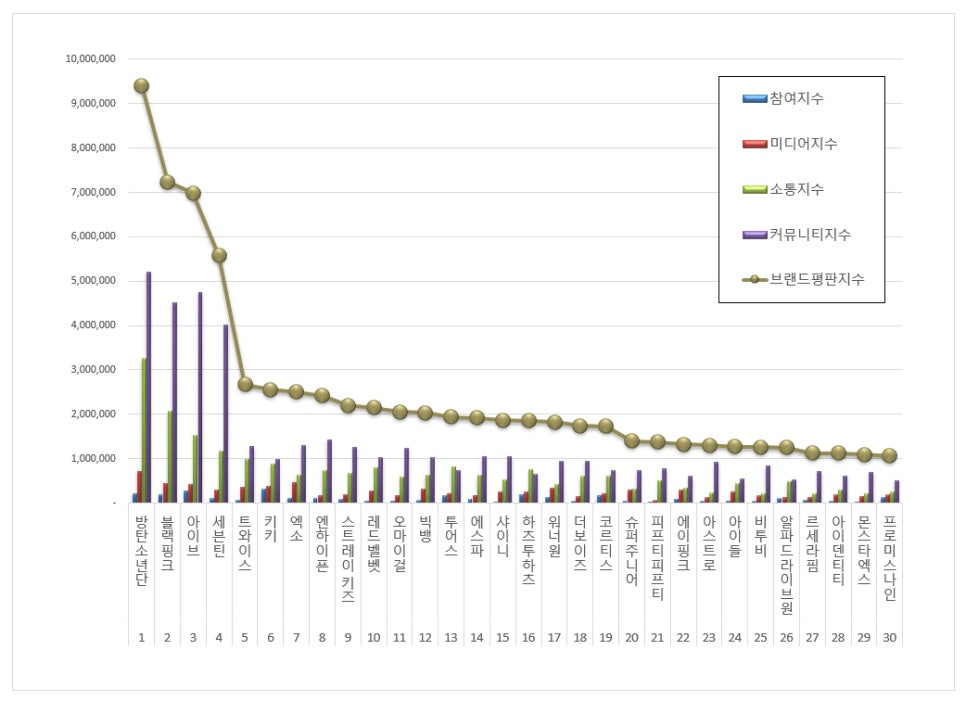 2026년 3월 아이돌그룹 브랜드평판 30위 순위는 방탄소년단, 블랙핑크, 아이브, 세븐틴, 트와이스, 키키, 엑소, 엔하이픈, 스트레이 키즈, 레드벨벳, 오마이걸, 빅뱅, 투어스, 에스파, 샤이니, 하츠투하츠, 워너원, 더보이즈, 코르티스, 슈퍼주니어, 피프티피프티, 에이핑크, 아스트로, 아이들, 비투비, 알파드라이브원, 르세라핌, 아이덴티티, 몬스타엑스, 프로미스나인 순으로 분석됐다.