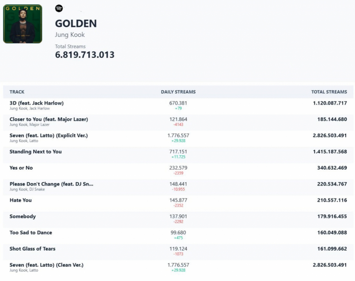 방탄소년단(BTS) 정국의 솔로 앨범 'GOLDEN'이 스포티파이에서 68억 회(필터링 전) 스트리밍을 기록하며 음반 파워를 입증했다.