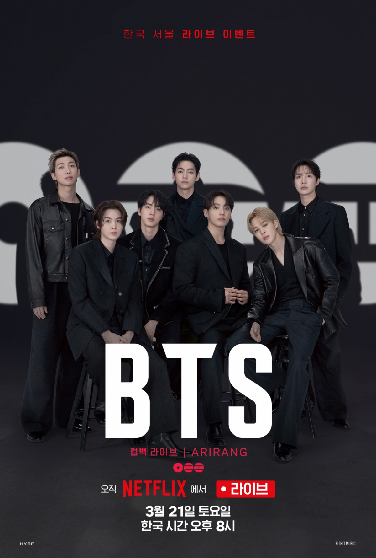 신보 발매 다음 날인 21일 오후 8시 광화문 광장 일대에서 'BTS 컴백 라이브: ARIRANG'(BTS THE COMEBACK LIVE|ARIRANG)을 개최한다. 이번 컴백쇼는 넷플릭스를 통해 전 세계 190여개 국가에 생중계된다.