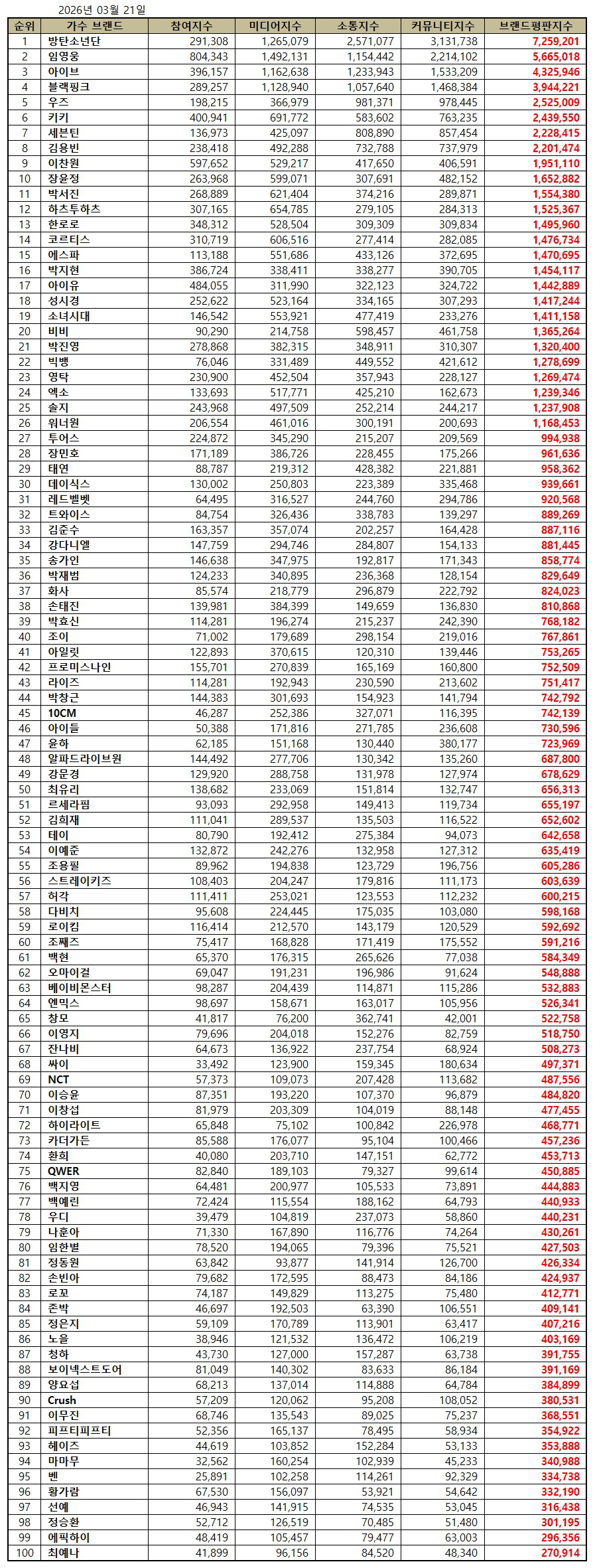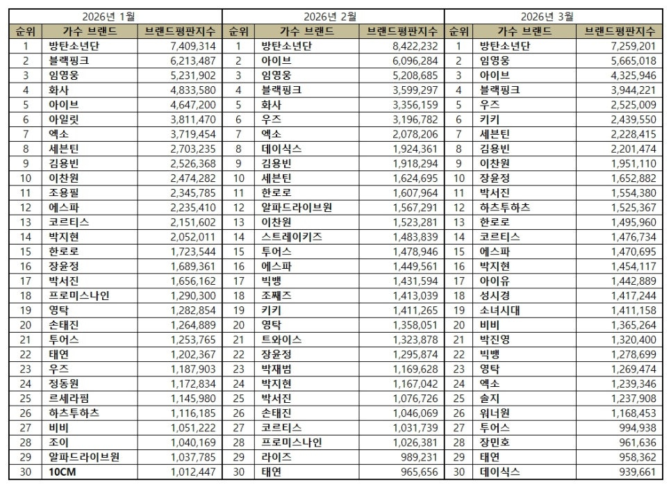 2026년 3월 가수 브랜드평판 30위 순위는 방탄소년단, 임영웅, 아이브, 블랙핑크, 우즈, 키키, 세븐틴, 김용빈, 이찬원, 장윤정, 박서진, 하츠투하츠, 한로로, 코르티스, 에스파, 박지현, 아이유, 성시경, 소녀시대, 비비, 박진영, 빅뱅, 영탁, 엑소, 솔지, 워너원, 투어스, 장민호, 태연, 데이식스 순으로 분석됐다.