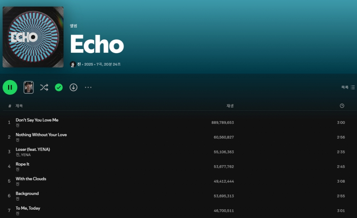 방탄소년단(BTS) 진의 솔로 앨범 'Echo'가 'Spotify'에서 누적 12억 스트리밍을 넘어서는 기록을 세우며 솔로 아티스트로서의 막강한 영향력을 다시 한번 입증했다.