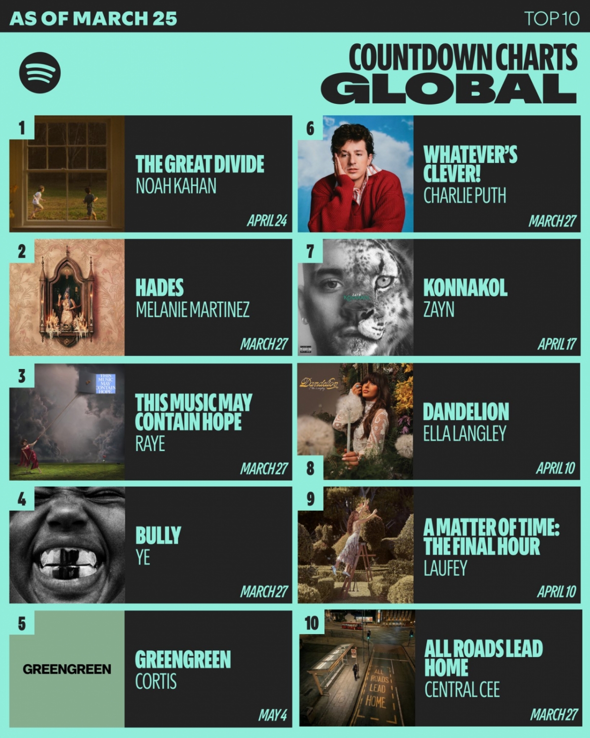 사전 저장은 스포티파이 이용자가 음반, 싱글 공개 전 알림을 신청하는 서비스다. 아티스트와 신보, 신곡을 향한 관심도를 가늠하는 핵심 지표로 통한다. 이번 주 전 세계 사전 저장 10위권에는 코르티스 외에도 글로벌 뮤지션 칸예 웨스트(Kanye West), 레이(RAYE), 레이베이(Laufey) 등이 이름을 올렸다.