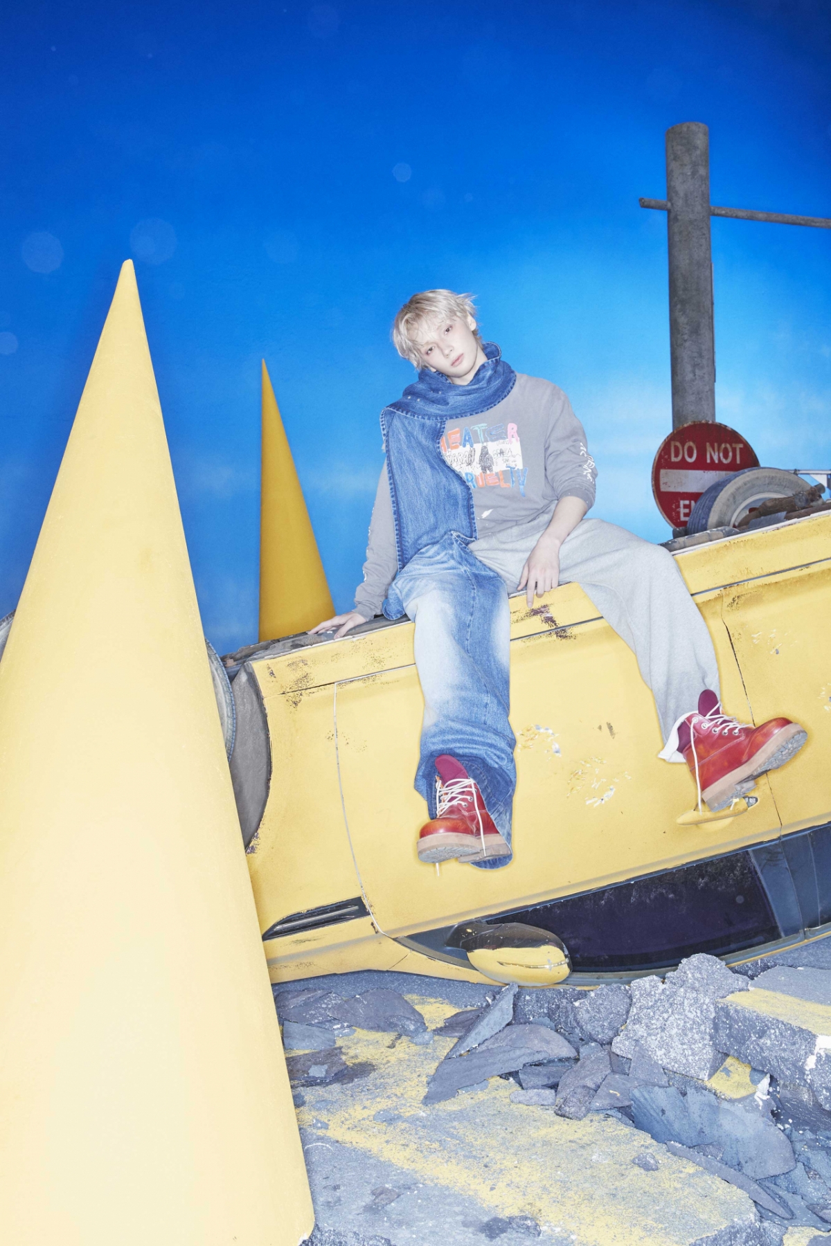 반면 멤버들은 편안한 차림으로 막 잠에서 깬 듯한 청량한 비주얼을 선보인다. 장바구니를 든 수빈, 부서진 자동차에 기댄 연준, 과일을 던지는 범규, 시리얼을 먹는 태현과 멍한 표정으로 뒤집힌 차 위에 앉은 휴닝카이의 사랑스러운 매력이 돋보인다. 이들의 평온함은 큰일이 일어났던 것 같은 배경과 대비를 이루며 신선한 분위기를 연출한다.