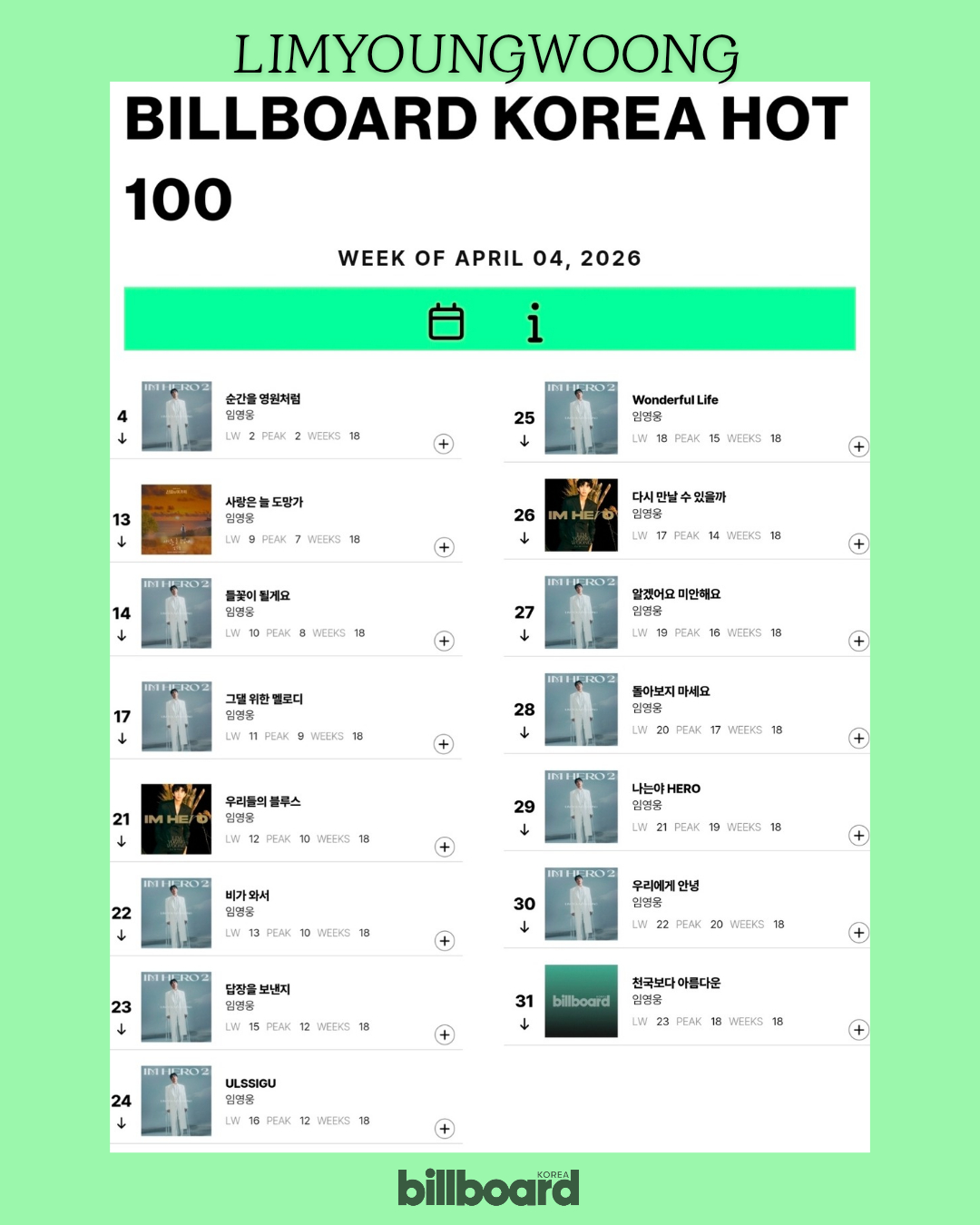 4월 1주 차 빌보드 코리아 발표에 따르면 임영웅은 메인 차트인 '빌보드 코리아 핫 100'에 15곡을 올려놓았다. 이번 기록은 18주 연속 차트인과 맞물리며 또 한 번 임영웅의 막강 음원 파워를 입증했다.