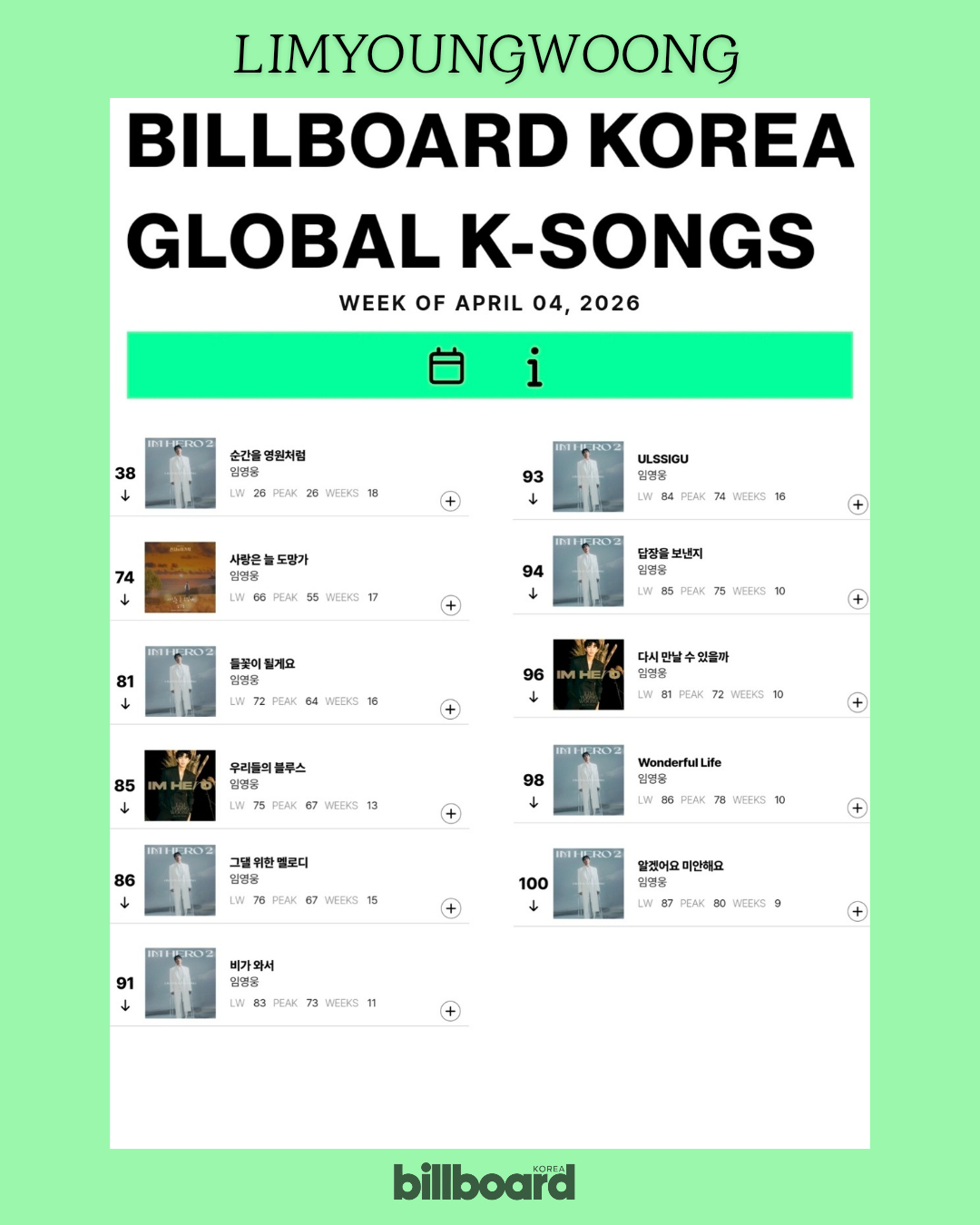 임영웅은 글로벌 차트에서도 성과를 냈다. 전 세계 데이터를 기반으로 한 '빌보드 코리아 글로벌 K-송즈' 차트 톱100에 11곡을 올렸다. '순간을 영원처럼'은 38위, '사랑은 늘 도망가'는 74위, '들꽃이 될게요'는 81위, '우리들의 블루스'는 85위를 기록했다.