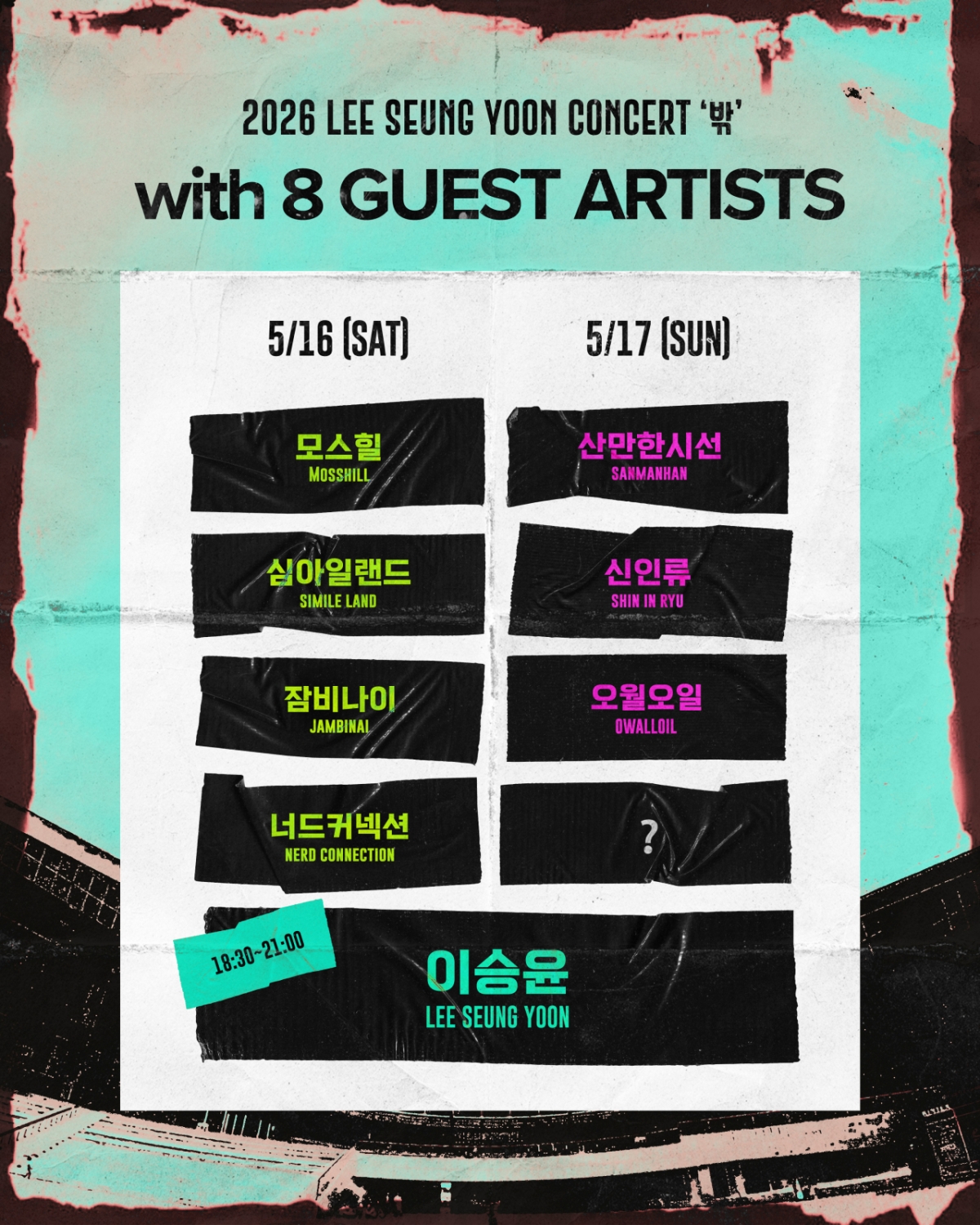 모스힐, 산만한시선, 심아일랜드, 신인류에 이어 잠비나이, 너드커넥션, 오월오일이 공개되며 더욱 다채로운 분위기가 연출될 것으로 예상된다. 특히, 17일 무대에는 여전히 물음표로 정체가 베일에 싸인 한 팀이 있어 궁금증을 자아낸다. 과연 어떤 게스트 아티스트가 마지막 퍼즐을 완성할지 이목이 쏠린다.