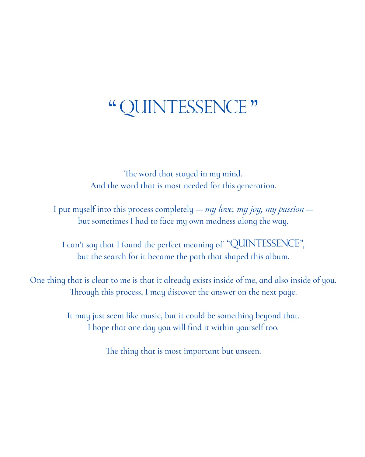 공개된 이미지에는 'QUINTESSENCE'라는 단어와 함께 의미심장한 메시지가 담겨 있어 눈길을 사로잡는다. '내 마음 속에 머무른 단어, 이 시대가 가장 필요로 하는 단어'라는 언급으로 시작해 '가장 중요한 것은 보이지 않는다'는 문장으로 마무리한 메시지는 궁금증을 자아내며 컴백 기대감을 높이고 있다.