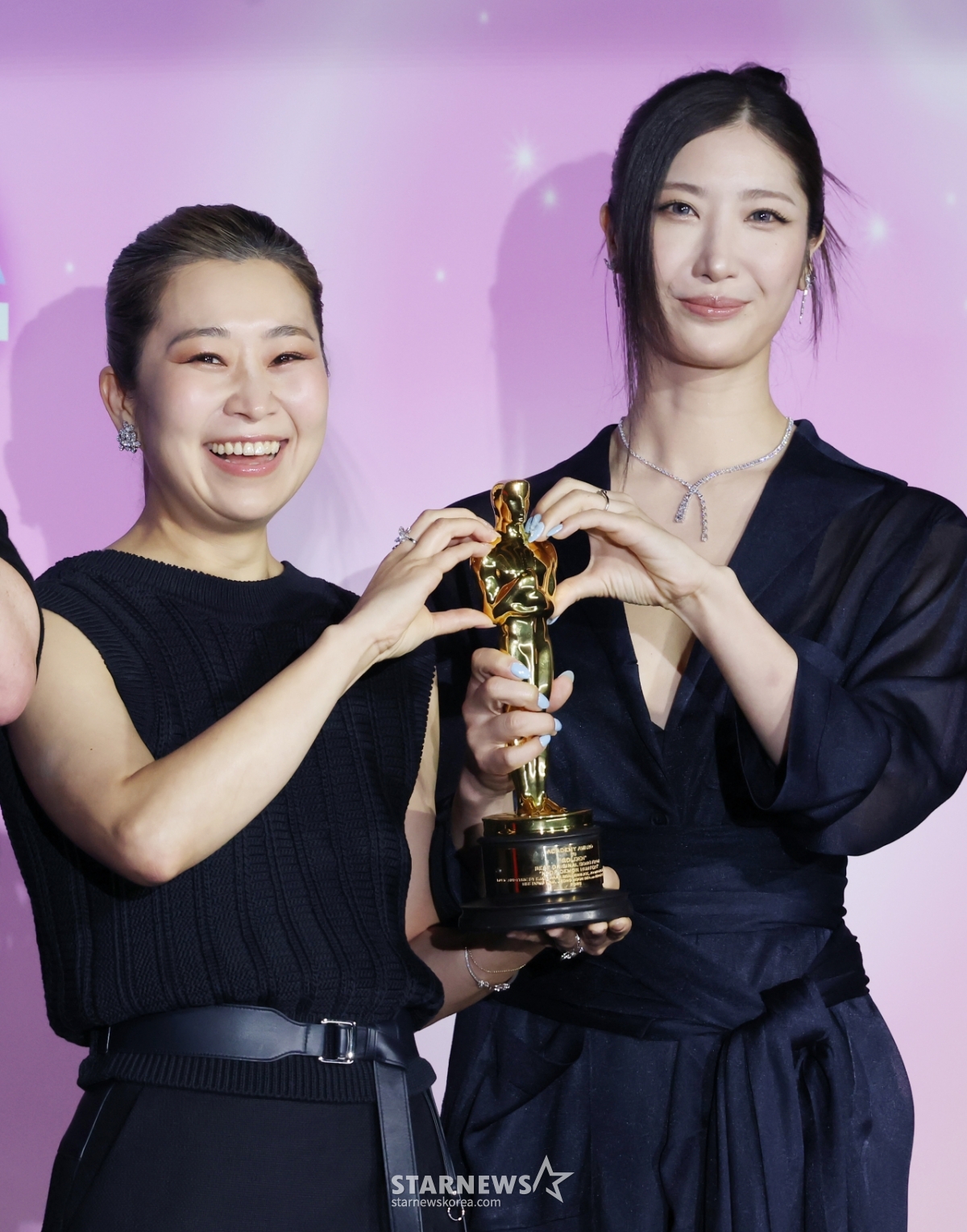 매기 강 감독, 싱어송라이터 이재가 1일 오후 서울 CGV용산아이파크몰에서 진행된 넷플릭스 영화 '케이팝 데몬 헌터스' 아카데미 수상 기념 기자간담회에 참석해 포즈를 취하고 있다. /2026.04.01