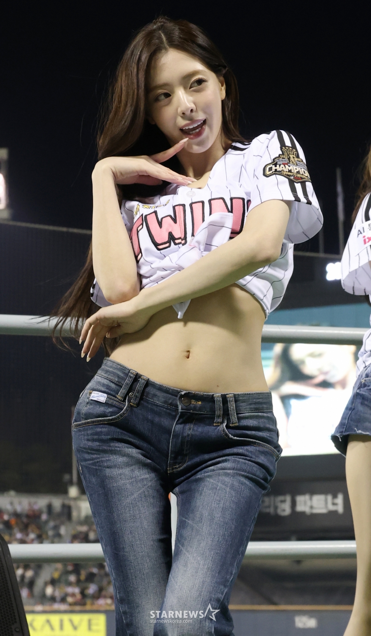 LG 승리기원 시구자로 나선 있지(ITZY) 유나가 클리닝타임 때 응원단상에 올라 치어리딩을 하고 있다.