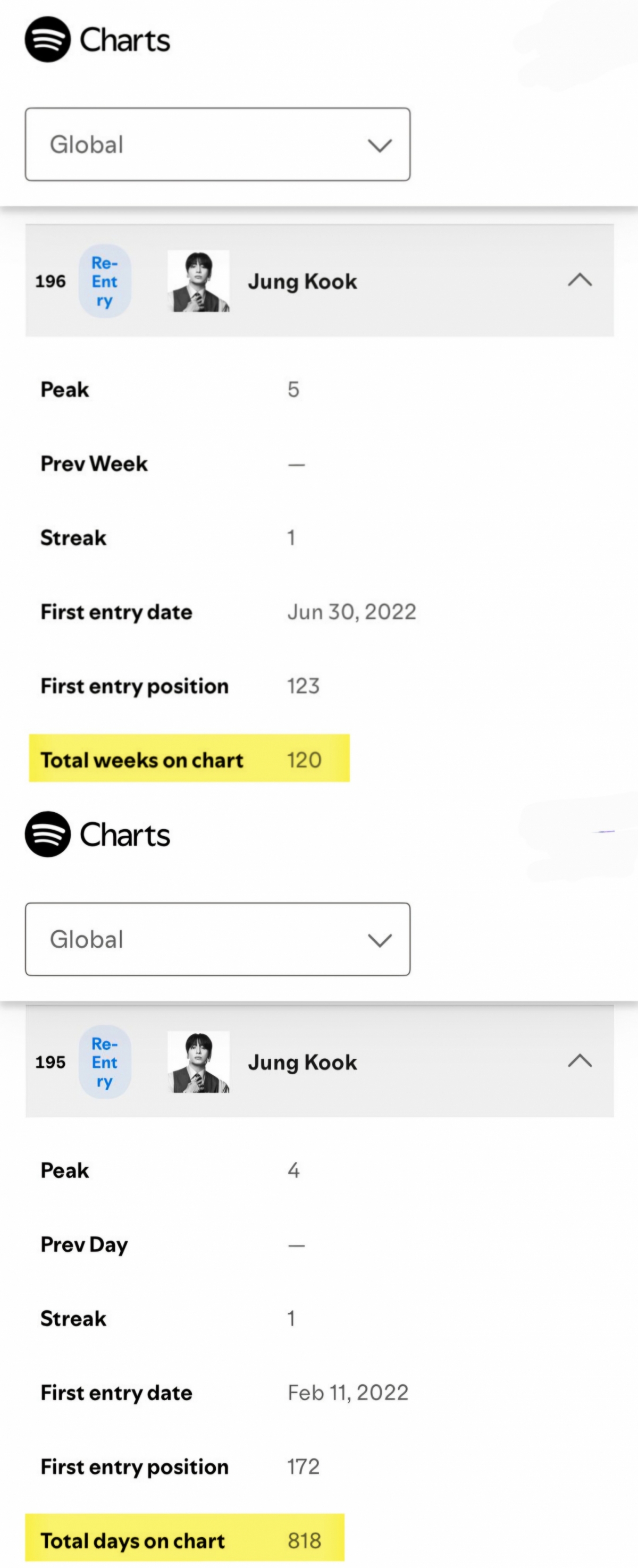 정국은 스포티파이 글로벌 데일리 톱 아티스트 차트에서도 195위로 재진입했고, 총 818일 동안 머물렀다.