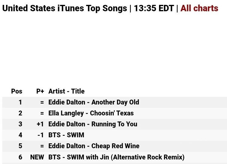 지난 1일(한국 시간) 발표된 월드와이드 아이튠즈(Worldwide Itunes) 송 차트(3월 31일자)에서 방탄소년단 신곡 'Swim'(스윔) 원곡 1위와 함께 그 리믹스인 'Swim with Jin'이 2위로 데뷔, 뜨거운 인기를 보였다.