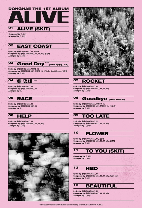 이외에도 '로켓(ROCKET)', '굿바이(Goodbye) (Feat. TABLO)', '투 레이트(TOO LATE)', '플라워(FLOWER)', '투 유 (스킷)(TO YOU (SKIT))', '해피벌스데이(HBD)', '뷰티풀(BEAUTIFUL)'까지 총 13개의 트랙을 수록, 다채로운 장르를 통해 리스너들에게 듣는 재미를 선사할 예정이다.