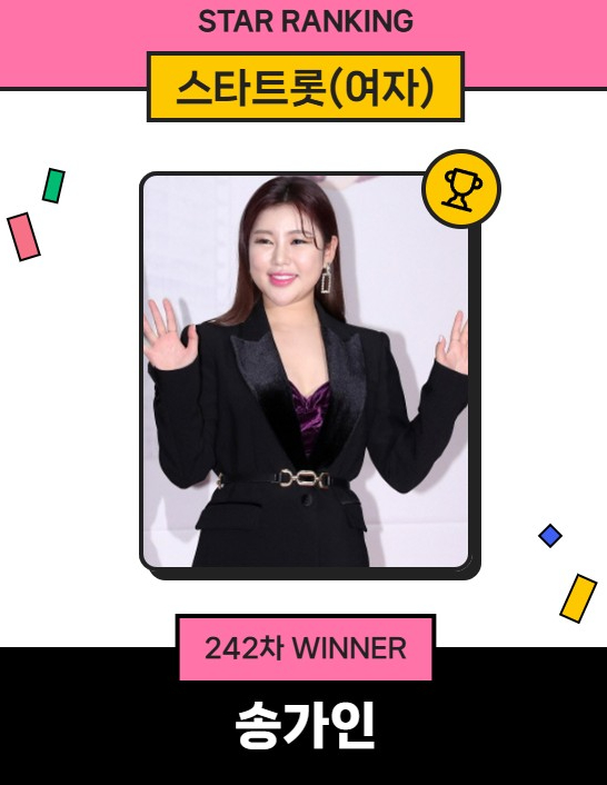 송가인은 지난 3월 26일 오후 3시 1분부터 2일 오후 3시까지 진행된 242차 스타랭킹 스타트롯 여자 랭킹 투표에서 10만3563표를 받고 1위를 차지했다.