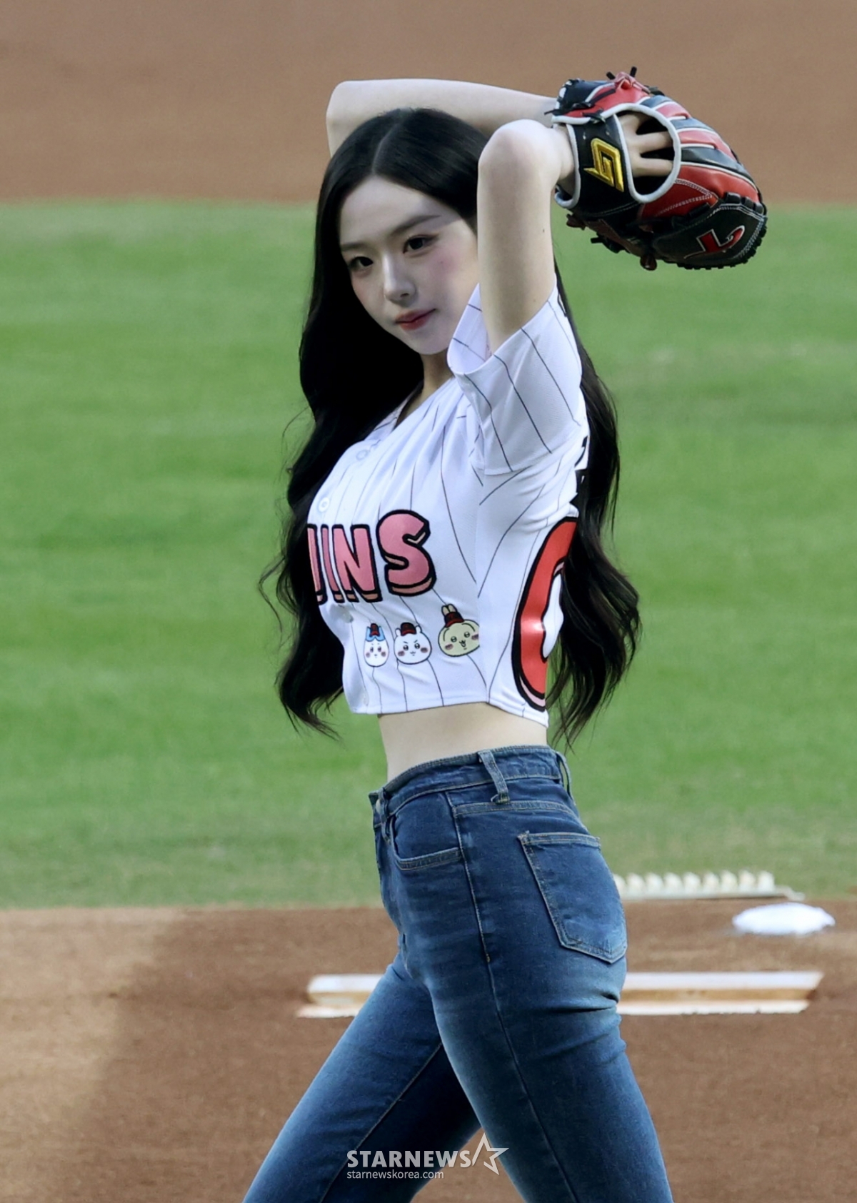 걸그룹 트리플에스(tripleS) 멤버 김채연이 LG 승리기원 시구를 하고 있다.