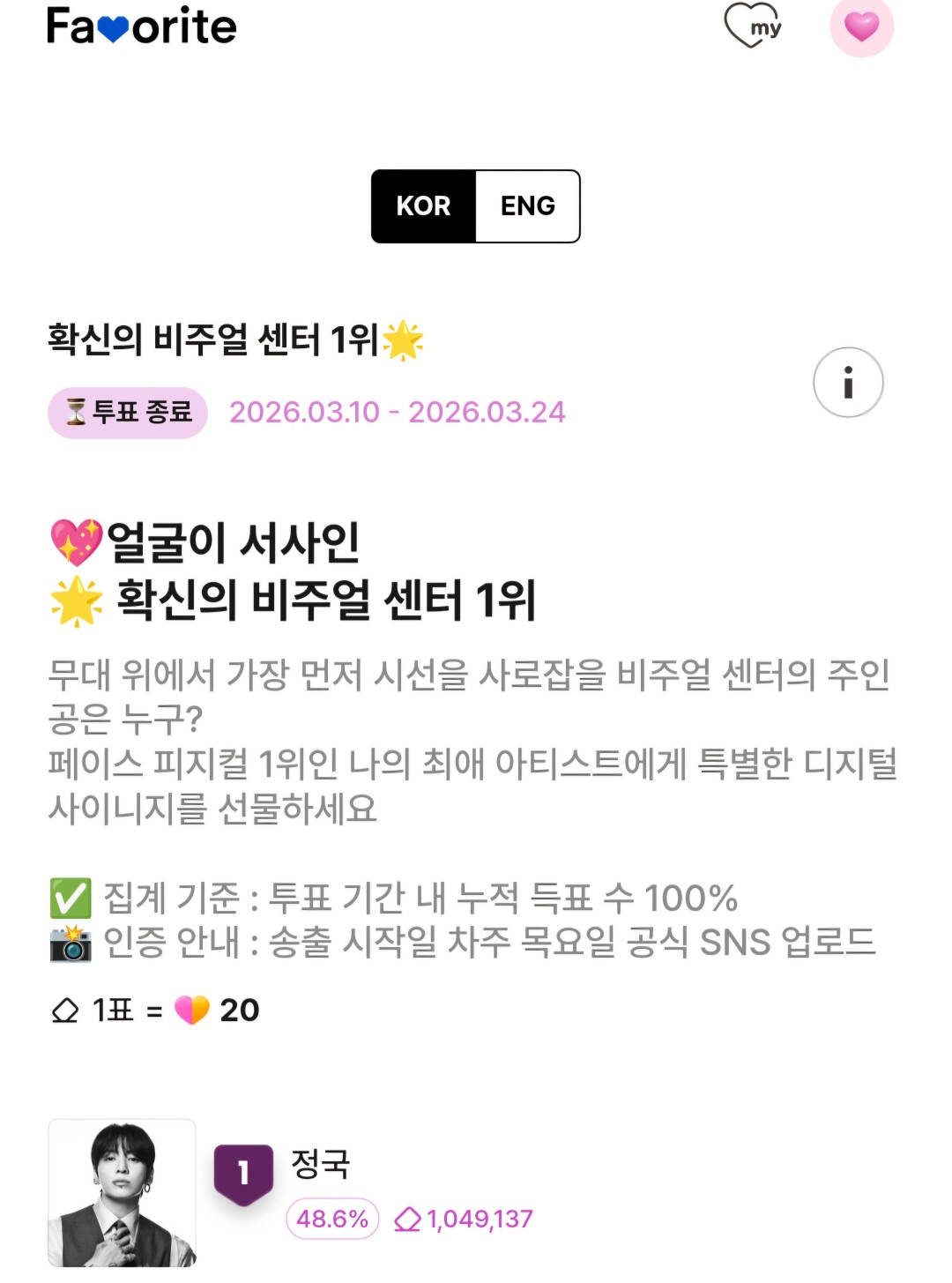 정국은 음원 플랫폼 벅스(Bugs)에서 3월 10일~3월 24일까지 진행한 '무대 위에서 가장 먼저 시선을 사로잡을 비주얼 센터의 주인공은 누구?' 설문에서 1위를 차지했다. 정국은 투표 수 총 104만 9137, 득표율 48.6%를 기록했다.