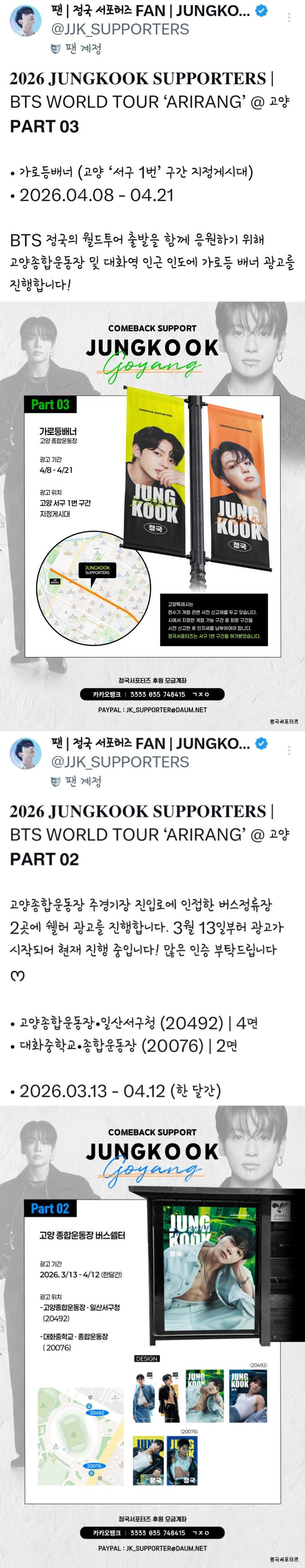 정국의 국내 팬클럽 '정국 서포터즈'는 소셜미디어 엑스(X·옛 트위터) 계정을 통해 정국만을 위한 BTS 월드투어 고양 서포트를 공개했다.