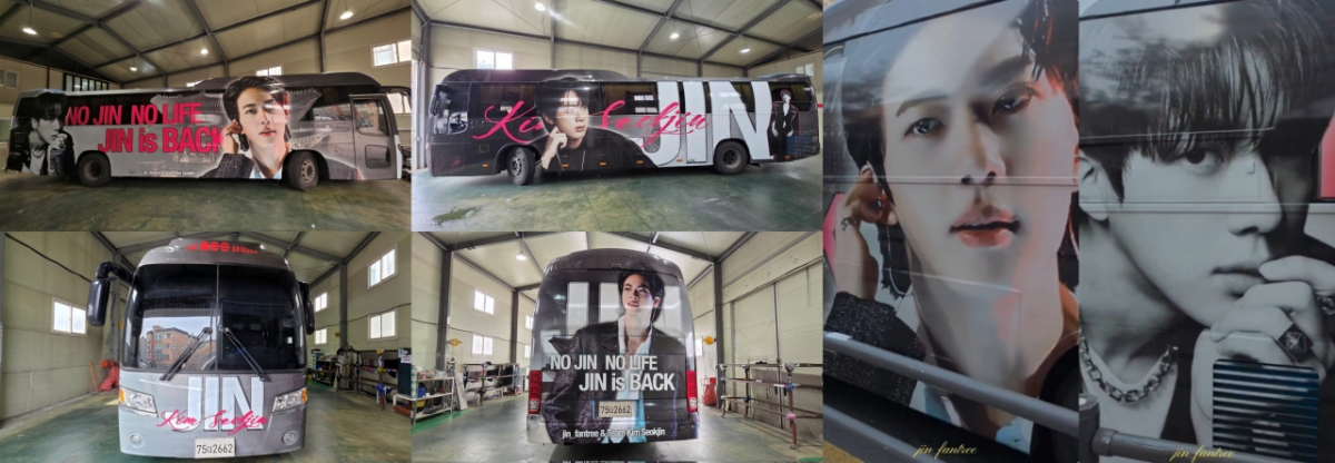 진의 팬 지니팬트리(@jin_fantree)는 래핑버스 서포트를 준비했다. '근본적인 아름다움' 진의 모습으로 래핑된 해당 버스는 4월 6일부터 12일까지 (10일 휴무) 운행되며 8일까지는 하이브 앞, 9일부터 12일가지는 고양 콘서트장 일대를 달린다.